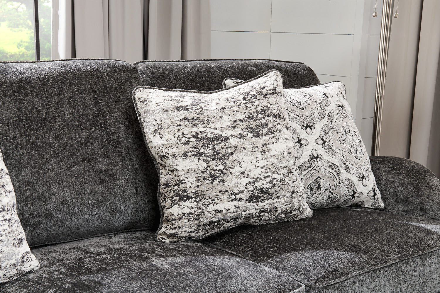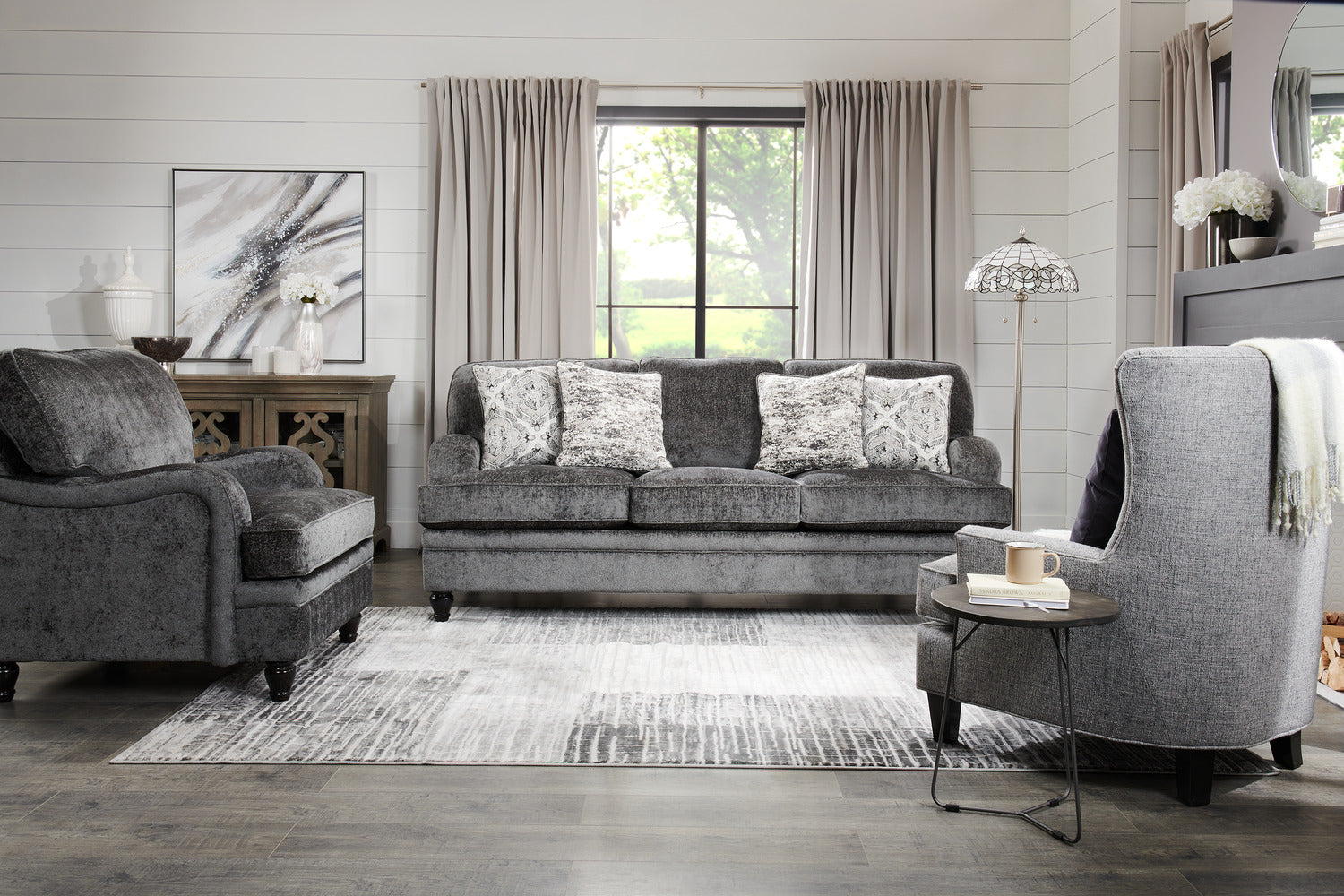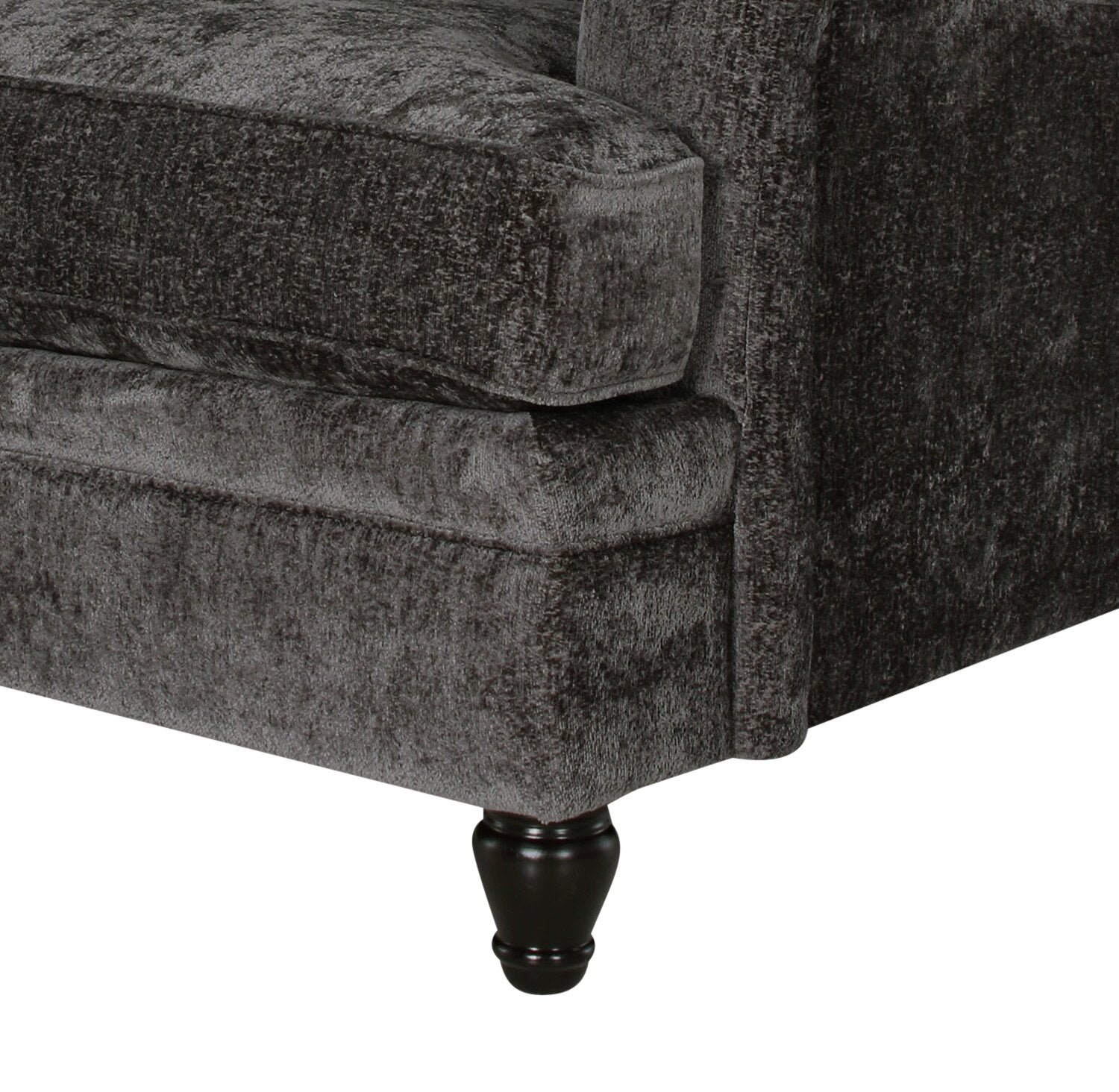 Make a refined style statement in your living space with this charcoal Bellmont sofa. Cozy chenille fabric cloaks the furniture frame with a dark grey hue to create a neat, tasteful look. Elegant details, such as the carved wood feet and rollover armrests, give this piece traditional charm your guests will love. Ready to enjoy movie night with your family? You certainly will be when you relax on the thick high-density foam cushions lining the seat and back. With four throw pillows adding extra comfort, this Bellmont sofa is ready to receive anyone looking for a rest.