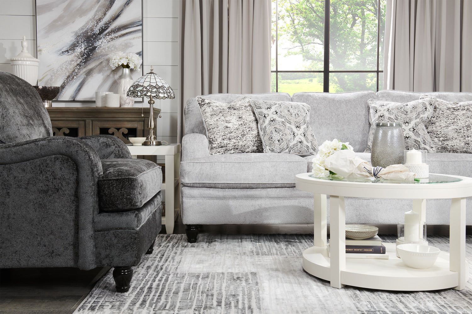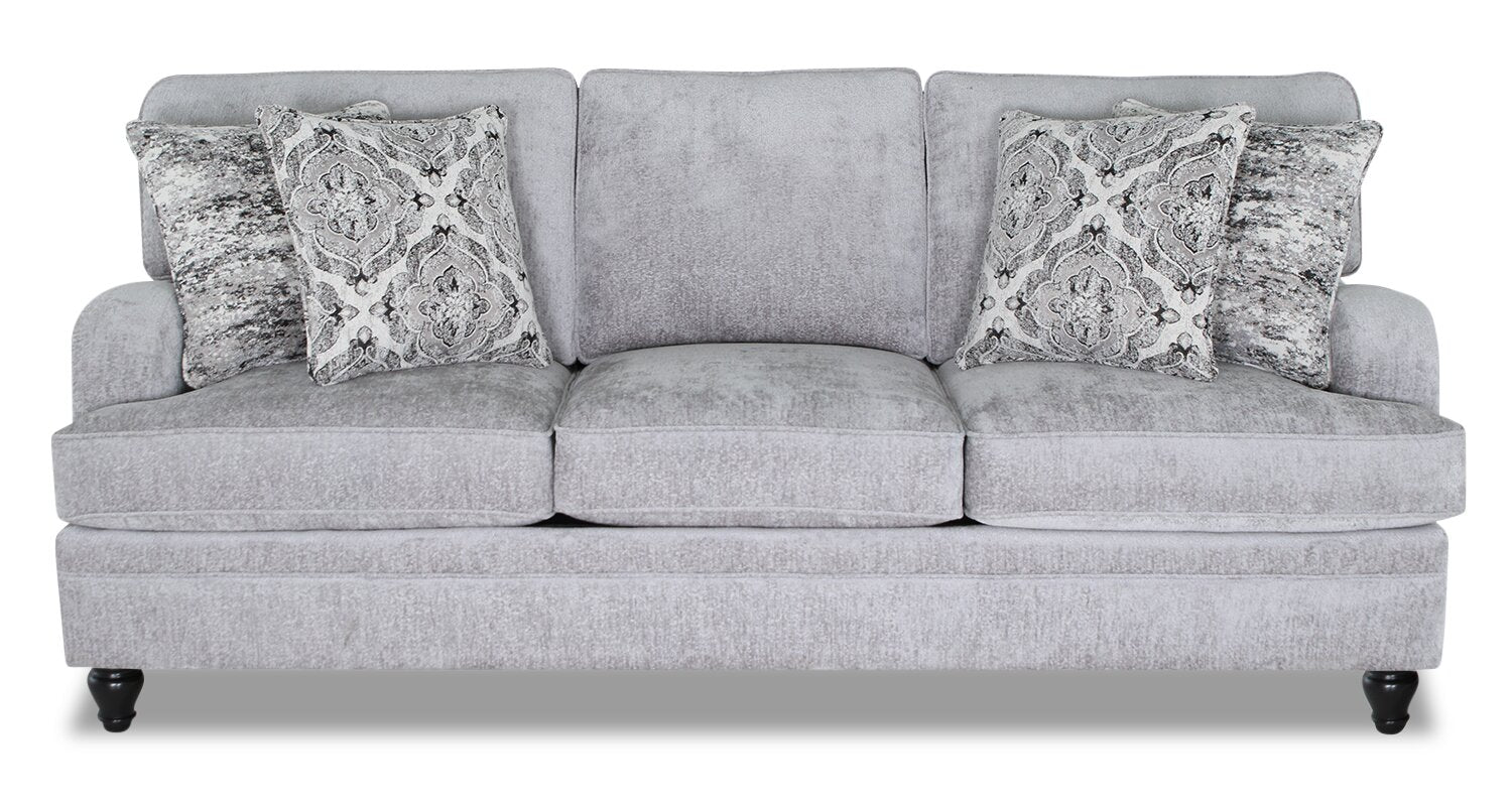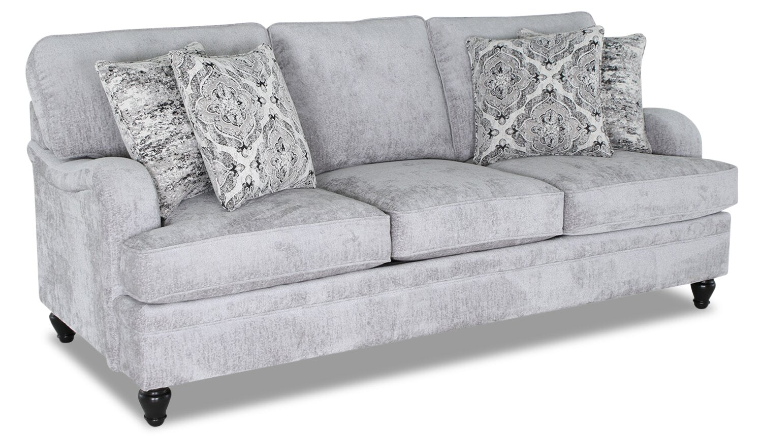 Make a refined style statement in your living space with this platinum Bellmont sofa. Cozy chenille fabric cloaks the furniture frame with a light grey hue to create a cool, tasteful look. Elegant details, such as the carved wood feet and rollover armrests, give this piece traditional charm your guests will love. Ready to enjoy movie night with your family? You certainly will be when you relax on the thick high-density foam cushions lining the seat and back. With four throw pillows adding extra comfort, this Bellmont sofa is ready to receive anyone looking for a rest.