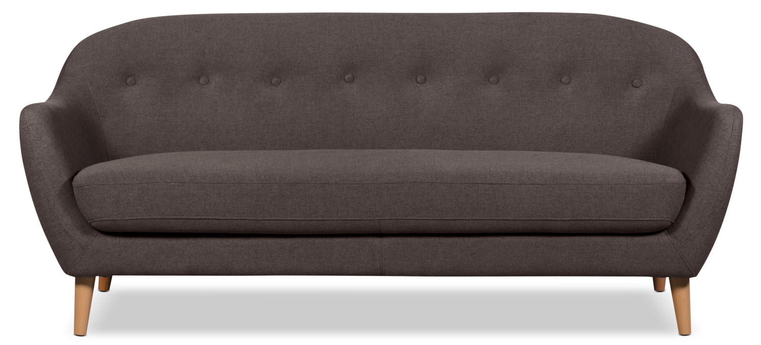 With a graceful and stylish profile, this dark grey Calla sofa helps you create the entertainment haven you are longing for. Featuring a streamlined design reflective of mid-20th century furniture, this couch's curved frame is both modern and timeless. Linen-look upholstery smoothly wraps around the high-density foam cushioning packed inside. As a finishing touch, pale-coloured beech wood legs and a single line of button tufting elevate this sofa from great to amazing.