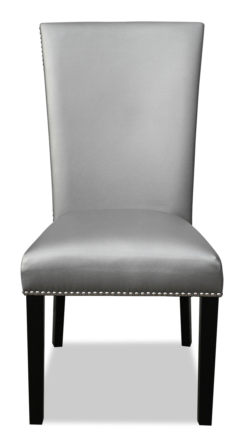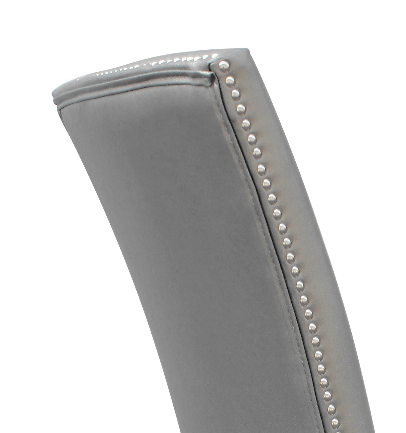 Add some contemporary elegance to your dinner tonight with this Cami grey dining chair. A tall, gently curving seatback rises up to keep your posture perfect. Smooth, grey faux leather adds a smoky touch to your dining space, while supple memory foam makes your seat extra comfortable. A row of glittering silver nailheads line the edges of the seat and the back to add a touch of sparkle. Sink into the Cami and let dinnertime become the highlight of your day.
