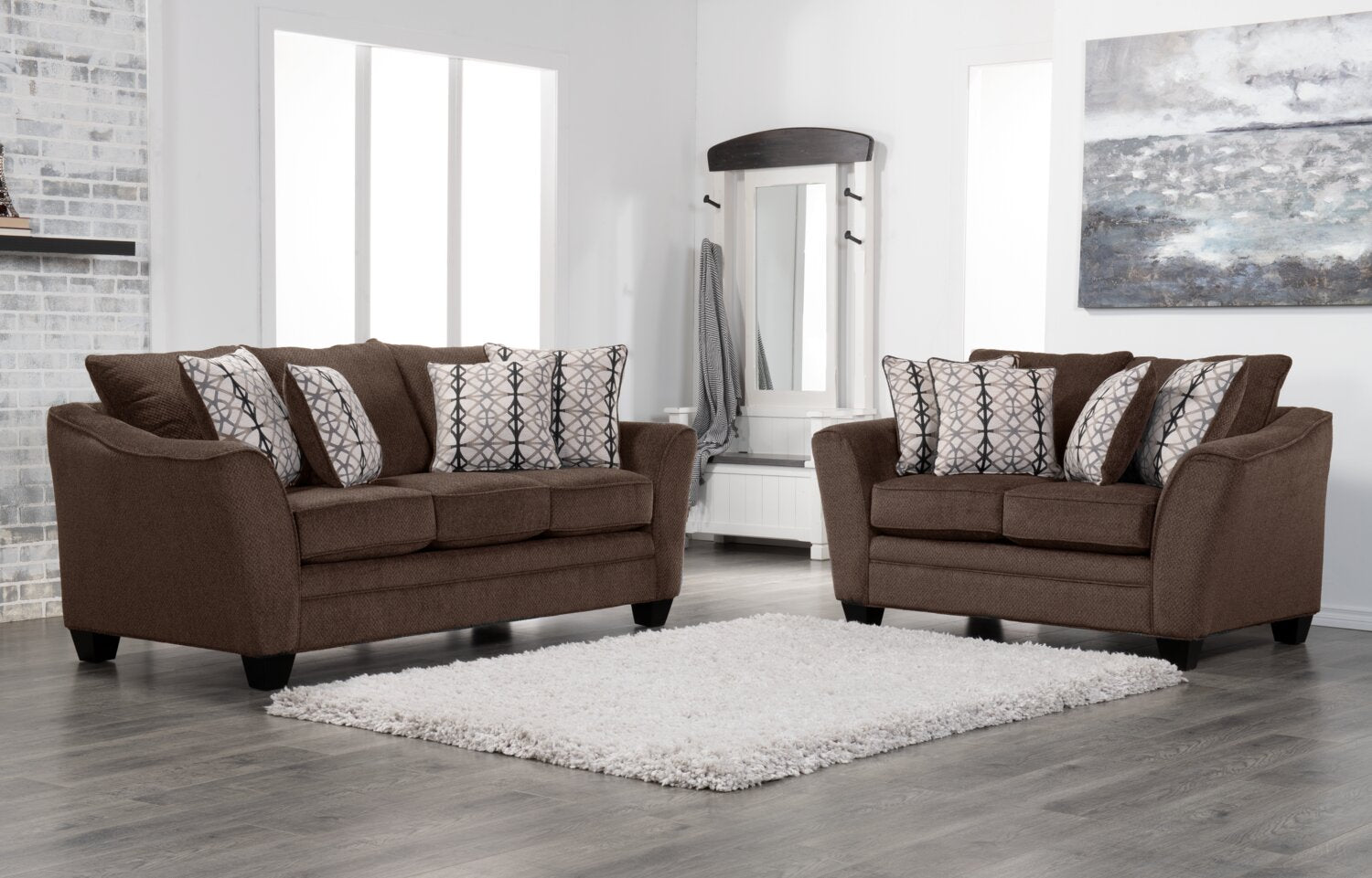 Made in Canada Febe 85" Chenille Fabric Condo-Size Sofa with Flared Arms and Accent Pillows - Brown | Sofa Febe de 85 po de format condo fabriqué au Canada en tissu de chenille avec accoudoirs évasés et coussins décoratifs - brun