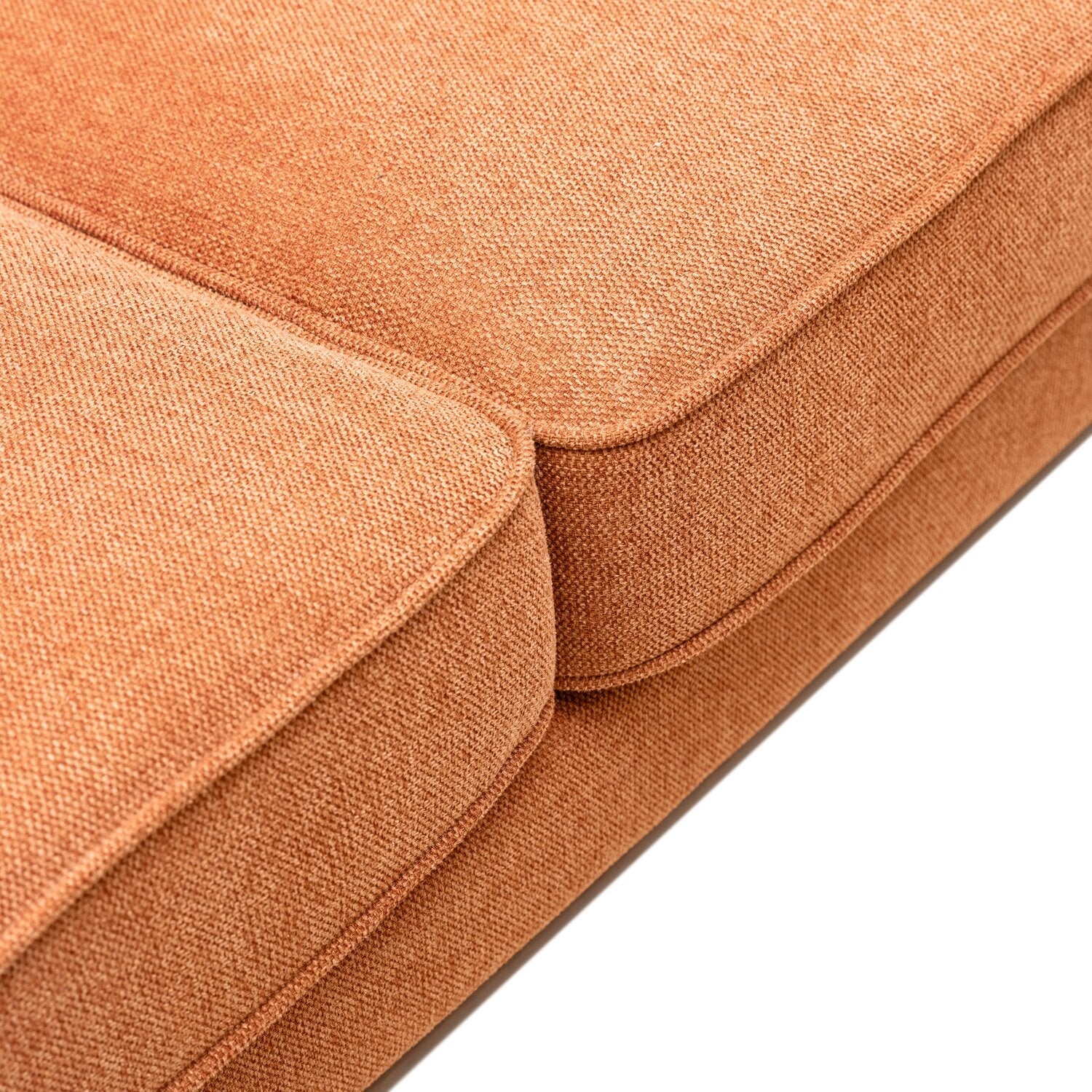 Feel trendy and comfortable when you’re resting in this Kassia condo size sofa from Kort & Co. Exclusive to The Brick, this piece will add a touch of casual style to your living space. The angled wooden legs lift the sofa for an airy feel, while the slanted arms and fabric piping add visual dimension and depth. Soft cushions wrapped in a trendy orange linen-look fabric welcome you to sit down and get comfy. Thanks to the crisp lines and balanced appearance, you don’t have to worry about clashing styles – instead you can simply enjoy the breath of fresh air the Kassia brings.
