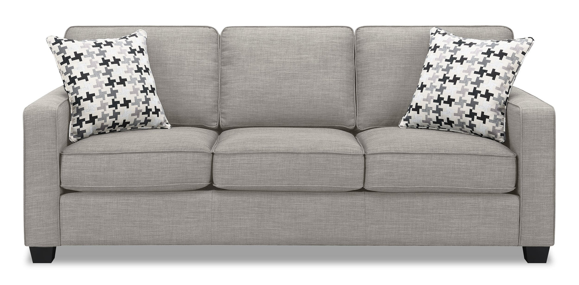 This Sawyer sofa is ready to bring a contemporary flair to any room in your home. Linen-look fabric cloaks this couch in a light grey hue – perfect for pairing with other decor choices to create a space all your own. Track armrests and fabric piping underscore the furniture's clean lines, while tapered plastic feet offer support without clashing against the upholstery. Inside the cushions, high-density foam is wrapped with fibre to keep your lounging comfortable. Make this Sawyer sofa the place for the whole family to relax.