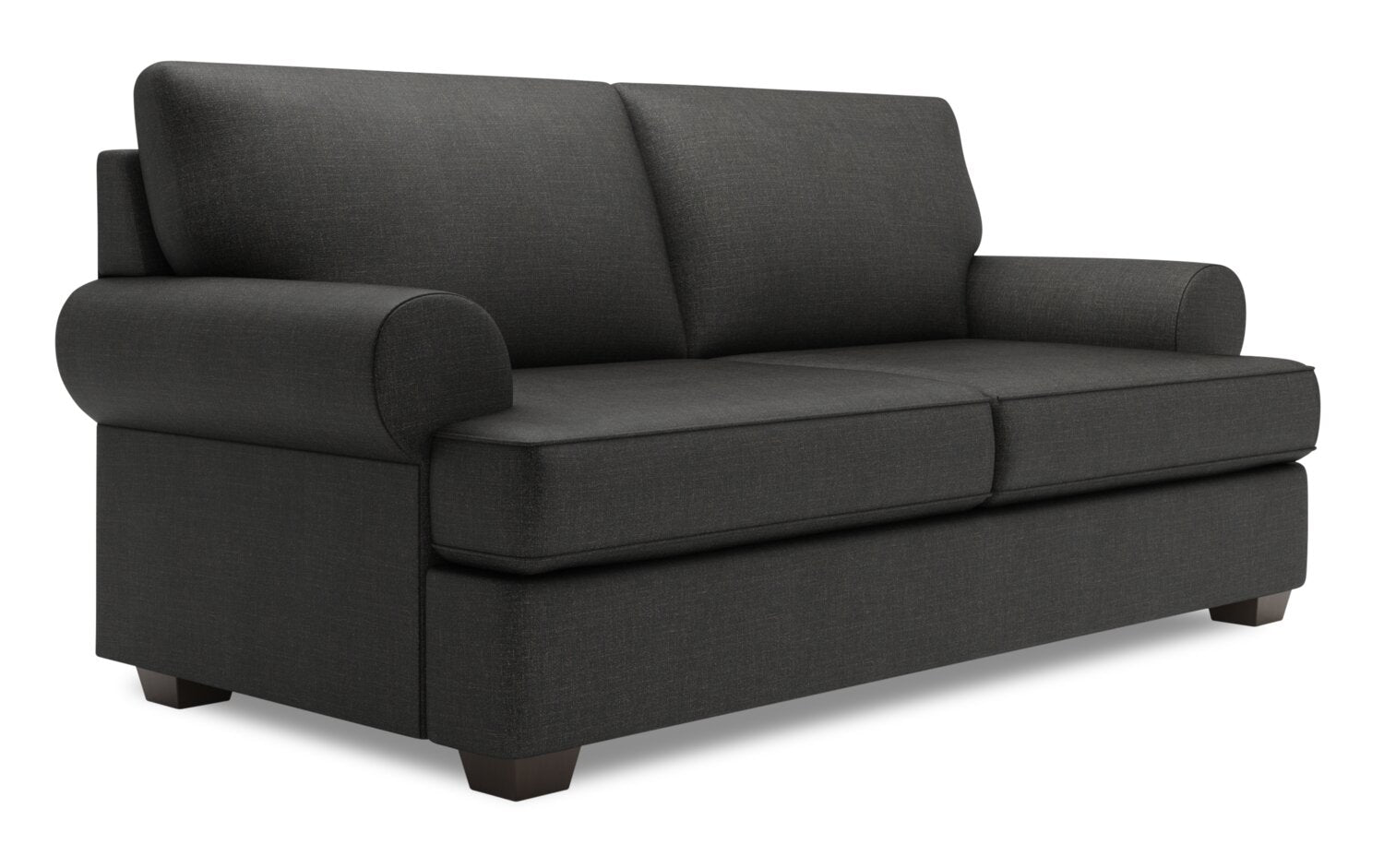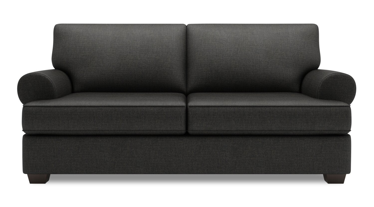 This Roll condo sofa from The Brick's exclusive Sofa Lab custom furniture program brings your personal style to a whole new level. Rolled armrests provide the namesake for this collection, while generously padded cushions and dark brown wood feet add a classic look to your space. Corner blocking the hardwood frame gives this piece the stability and support your family needs. Take your pick from three fabrics, each with a choice of six colours, then watch the Roll condo sofa turn your living room into a reflection of your decor style.
