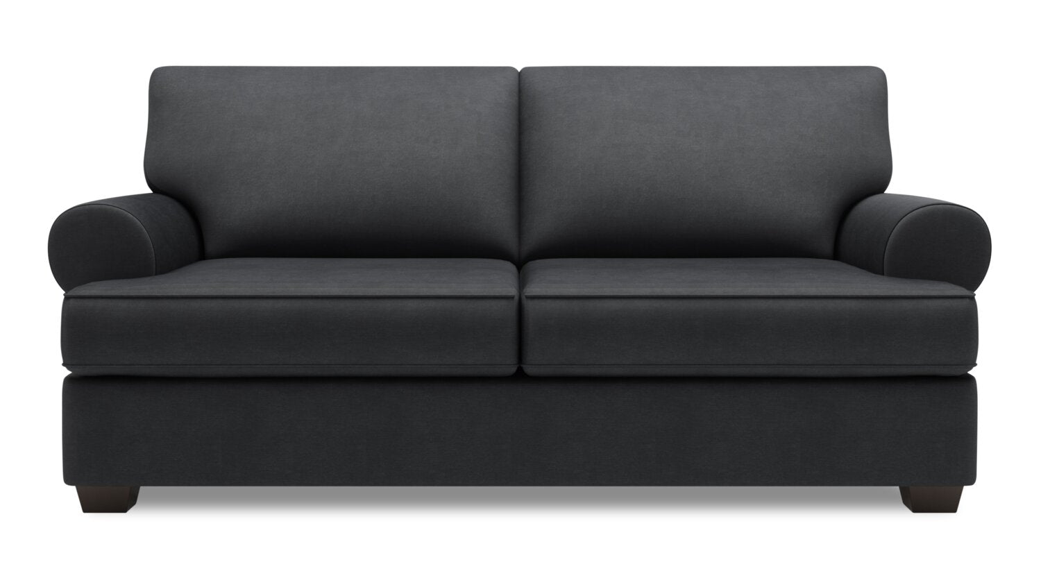 This Roll condo sofa from The Brick's exclusive Sofa Lab custom furniture program brings your personal style to a whole new level. Rolled armrests provide the namesake for this collection, while generously padded cushions and dark brown wood feet add a classic look to your space. Corner blocking the hardwood frame gives this piece the stability and support your family needs. Take your pick from three fabrics, each with a choice of six colours, then watch the Roll condo sofa turn your living room into a reflection of your decor style.