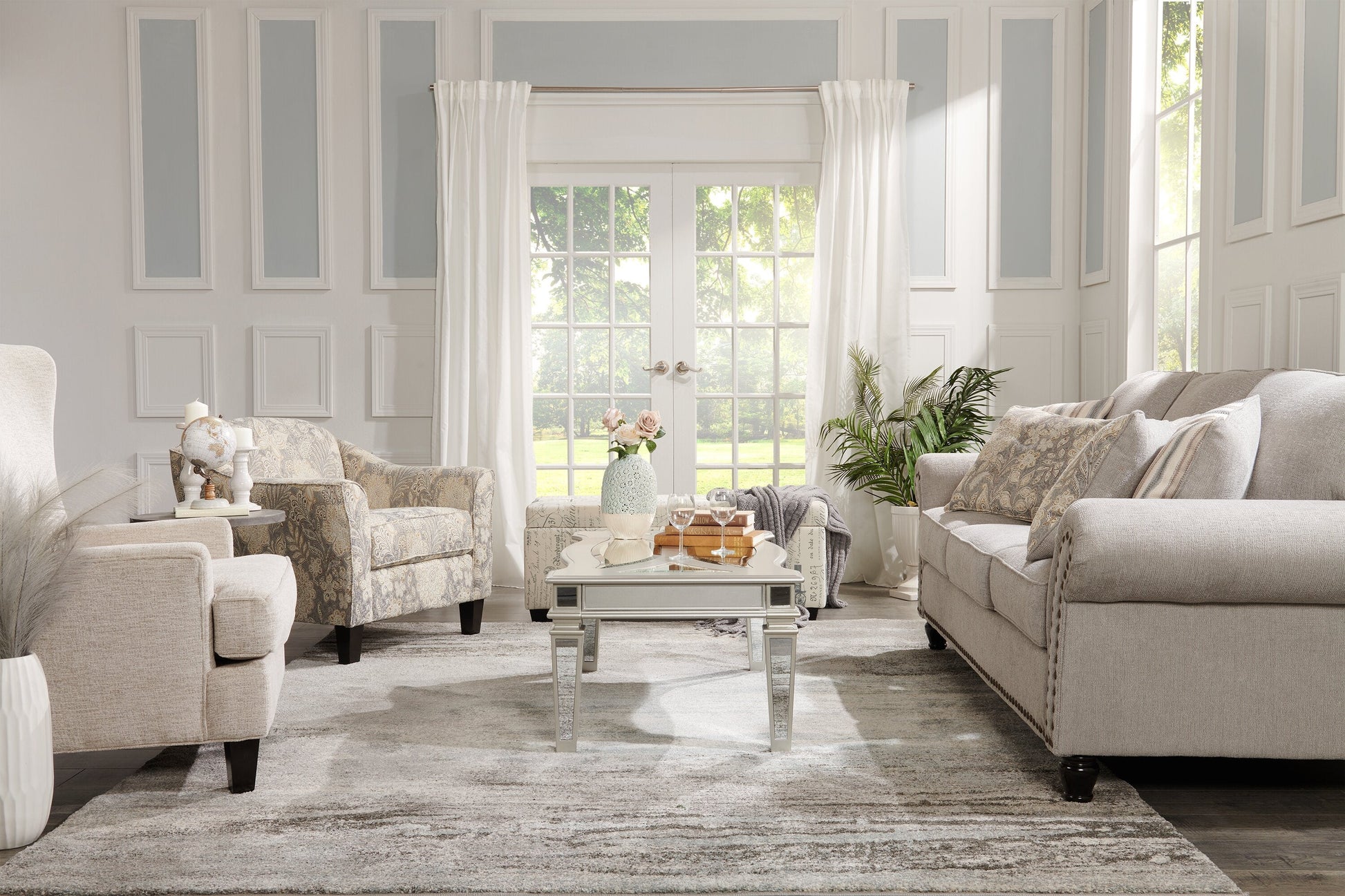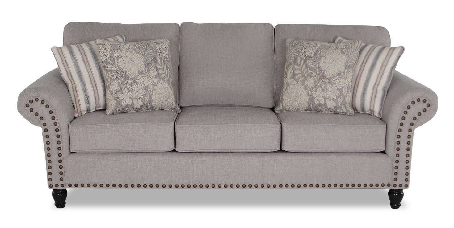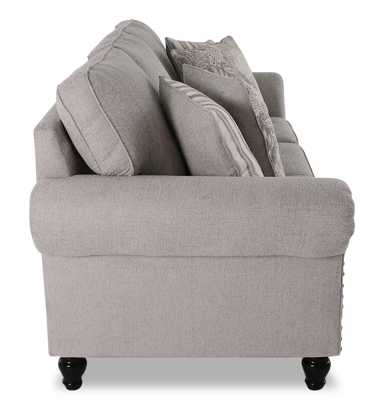 Traditional touches make this Wynn sofa a refined addition to your space. Grey chenille cloaks the furniture frame, adding a soft touch you'll want to cozy up to once you get home. Furthering that comforting feel are high-density foam cushions outlined with fabric piping to showcase how much relief you'll get when you take a seat. Brass nail heads line the base and rolled armrest fronts for a classic look you won't be able to resist. With four accent pillows for some stylish flair, this Wynn sofa makes for a welcoming sight.